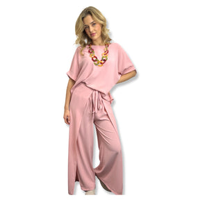 The JCUK Flowing Split Skirt Pants Knot Fasten at Front Ladies Co-ord Sets are perfect for spring, summer or autumn. The medium clothing length with half length batwing sleeves really makes this piece stand out as a stylish choice. The ankle-length inseam is perfect if you're looking for something that's not too long or too short - just right!