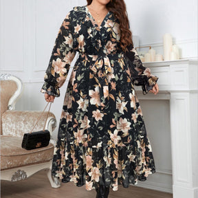 Ladies Long Dress Chiffon Ruffle Long Dress With Large Flowers Contrast Pattern Size Fits 12-24 Plus Size