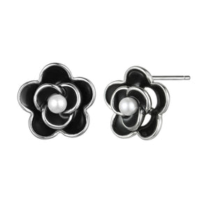 Silver Small Camellia Earrings with Pearl Centre YX12005SLR