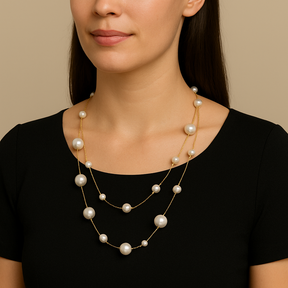 This sophisticated long necklace features lustrous white imitation pearls in varying sizes, gracefully spaced along a delicate gold-tone chain. The design exudes timeless elegance with a modern twist, perfect for layering or wearing alone as a statement piece. Whether paired with formal attire or casual ensembles, this necklace adds a touch of refinement and charm to any outfit. Ideal for weddings, evening events, or everyday glamour.