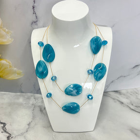 Inspired by natural ocean wave, this elegant two-layer necklace features large marbled wave beads in many vibrant color. Accented with clear faceted crystals and strung on delicate golden chains, it brings a warm, grounded sophistication to both casual and dressy looks.