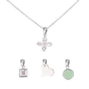 Cross pendant charm comes with three interchangeable charms; Squared gem, heart, green circle.