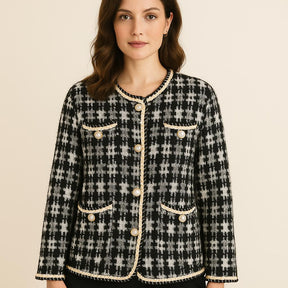 ✨ Elevate your wardrobe with the JCUK Ladies Tweed Jacket Cardigan. This Parisian vintage style jacket features a classic black and white check pattern, perfect for versatile styling. The luxurious pearl buttons add a touch of sophistication, while the refined finish ensures a polished look. Real front pockets offer both functionality and style. Available in plus sizes UK 10-22, this jacket is a must-have for any fashion-forward woman.